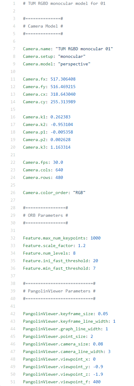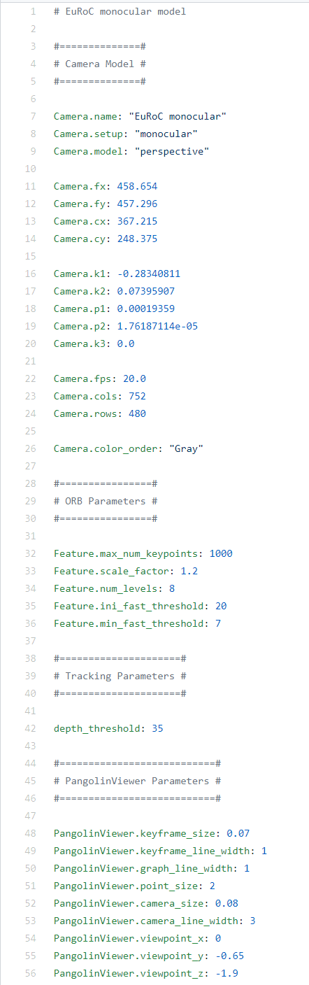 openVSLAM 깃허브 example 폴더에 config파일이 몇 개 있는데, 그 중 perspective 카메라 보면 공통적으로 캘리브레이션 파라미터가 들어간다. 맞게 만든 듯!