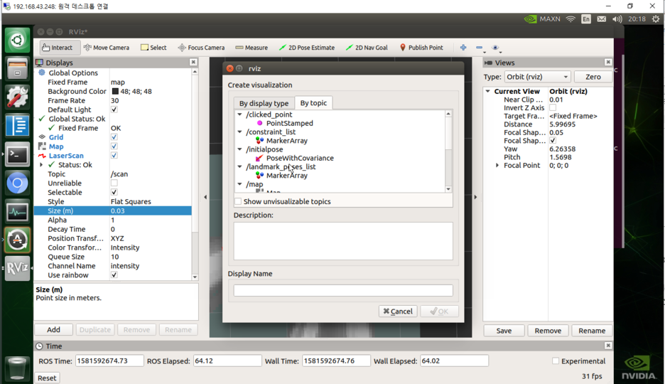 센서가 수집하는 데이터의 값은 ROS의 rviz를 통해 디스플레이 가능하다.