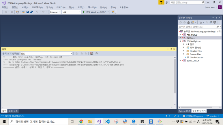 맨 마지막 줄에 빌드 파일이 생성된 경로까지 알려준다. 이제 비쥬얼 스튜디오를 이용해 PDFNetLanguageBindings.sln를 열어서 SDK에 있는대로 X64 Release 모드를 설정한다.