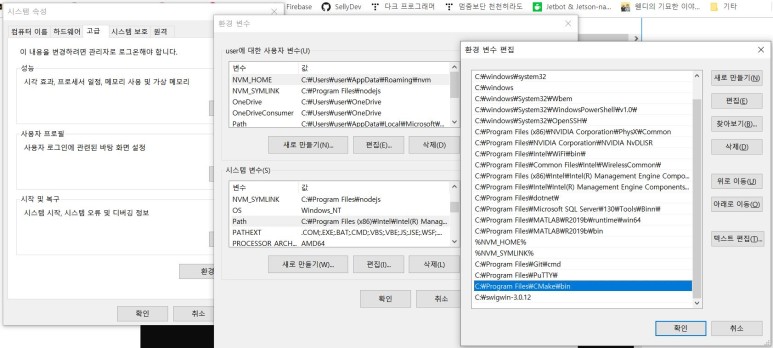 이 때, 환경변수는 모두 응용 프로그램(exe)가 있는 경로로 등록해야 한다. cmake의 경우는 gui 파일이 있는 경로로 입력한다.