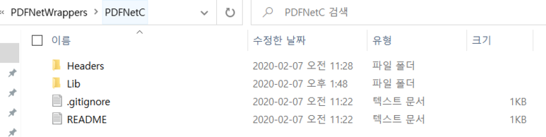 위의 PDFTron PDF 라이브러리를 다운로드 받으면 폴더 이름은 PDFNetC64이다. 위 폴더에서 Headers와 Lib를 복사한다. 클론한 프로젝트 폴더 내부의 PDFNetC 폴더에 다음과 같이 복사한 Headers와 Lib을 붙여넣는다.
