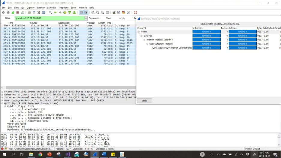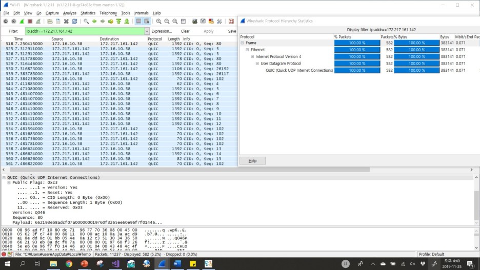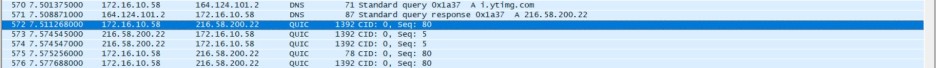 일단 Youtube 관련된 IP 주소에서 쓰이는 패킷들이 QUIC임을 확인할 수 있다.