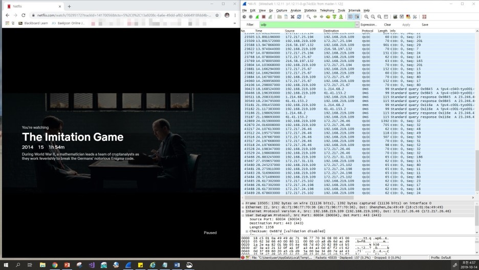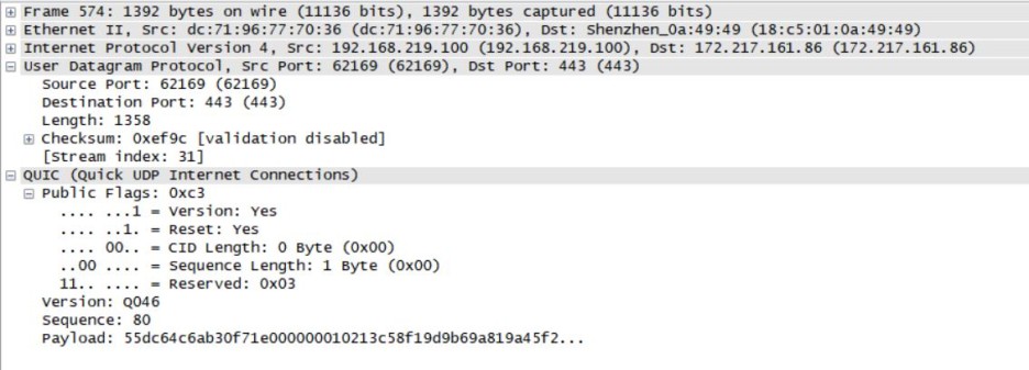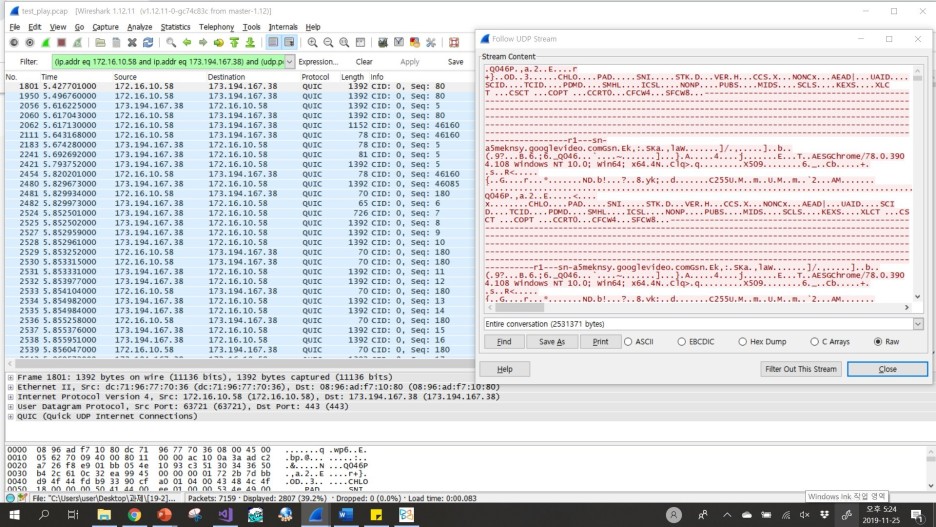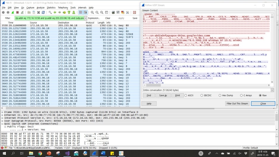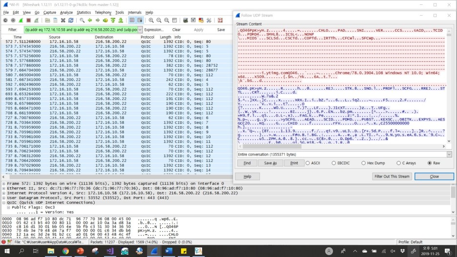 유튜브 동영상으로부터 패킷을 얻는 모든 과정은 QUIC 프로토콜을 사용하여 이루어지고 있다.