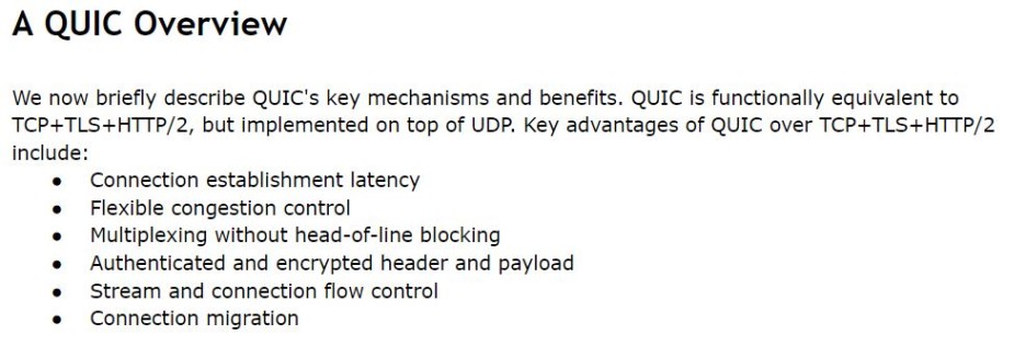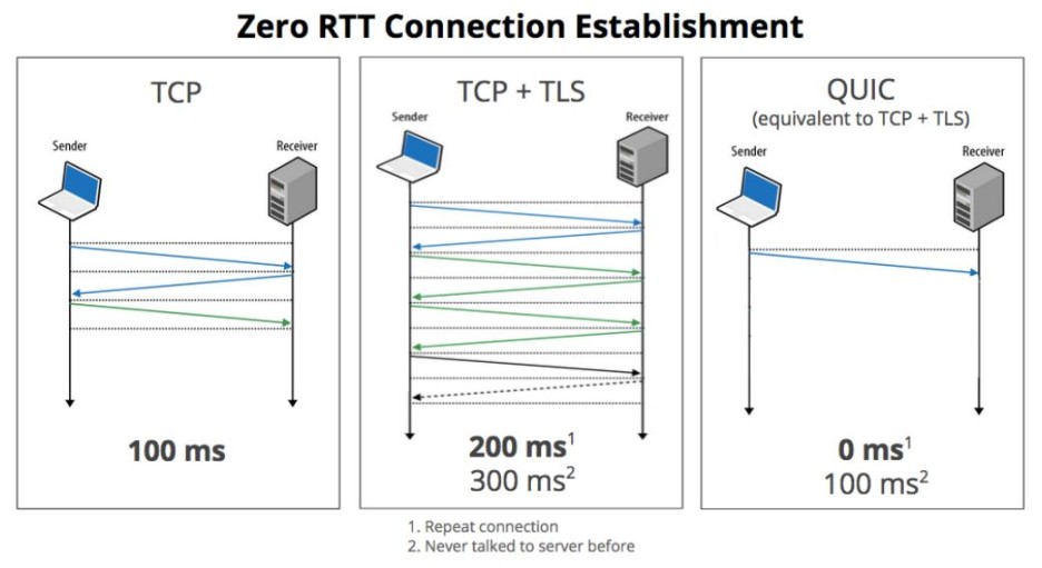 QUIC의 규격 문서 맨 윗줄에 나와있듯이, QUIC은 TCP의 지연 시간을 줄이기 위해 등장했다. 따라서 가장 큰 특징은 빠른 전송 속도에 있다. 이를 위해 QUIC은 UDP 위에서 동작하기 때문에, 이론적으로 RTT가 0이다.