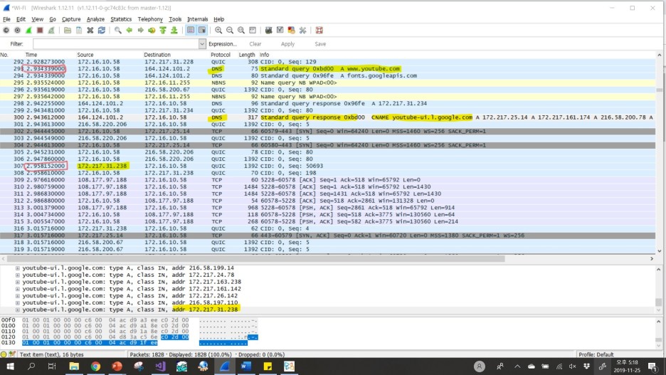 Youtube에 접속하기 위해 도메인 youtube.com을 사용했으므로 dns 필터를 통해 youtube 관련 IP를 찾는다. 이 때, 크롬의 주요 기능인 자동완성(이미 검색한 것은 저장되어 다음에 검색할 때 자동으로 완성되는 기능)을 통해 유튜브에 접속하면 youtube관련 dns가 잡히지 않으므로 꼭 youtube.com으로 검색한다.