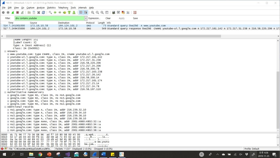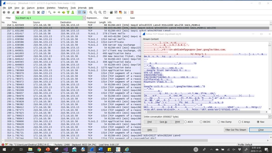 위에서 r7---sn-ab02a0nfpgxapox-bh2es.googlevideo.comm따위의 이름을 갖는 것이 동영상 서버임을 알았다. 가장 많은 패킷을 보낸 주소를 따라가보면