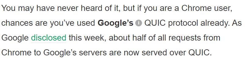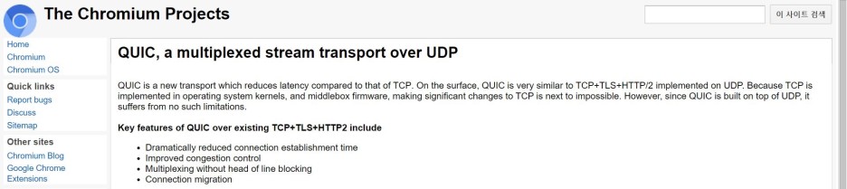 크롬 공식 규격 문서에서 QUIC에 대한 설명을 찾을 수 있었다. 문서를 훑어보니, QUIC은 TCP의 특성상 발생하는 latency(전송 딜레이?)를 줄이기 위해 구글에서 만든 프로토콜이라 한다.