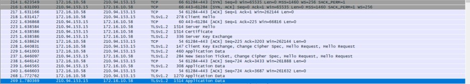 동영상 서버의 IP와 통신을 시작하기 전, 3-way handshake 과정 및 TLS 통신 과정을 거쳐, 서버로부터 동영상 패킷(1514B)을 1.780369초부터 받기 시작한다.