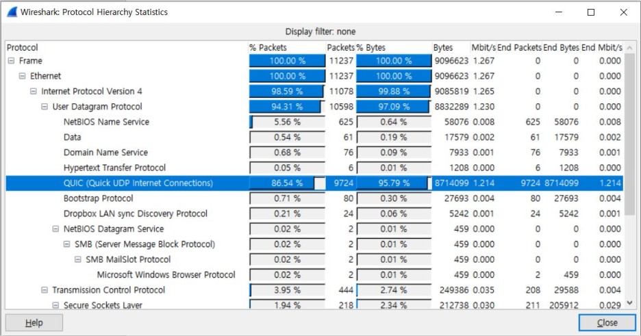 크롬 브라우저를 통해 유튜브에 접속하는 전체 과정에서 대부분 QUIC 프로토콜을 사용함을 발견하였다.