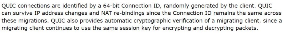 또한, QUIC은 64비트 Connection ID라는 패킷 식별자(identifier)를 사용하므로 클라이언트와 서버가 한 번이라도 데이터 전송을 수행했다면 심지어 IP주소가 변경되어도 작동할 수 있다고 한다.