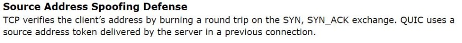 또한, QUIC은 source address token을 이용해 client 주소를 검증함으로써 spoofing에 의해 출발지 IP가 변조된 것을 알아내고 방어(defense)한다. 이것은 TCP에서 SYN, ACK의 sequence number 교환을 통해 맞는 client인지 검증하는 것과 같은 기능을 한다.