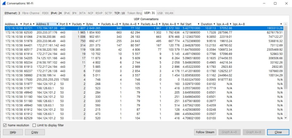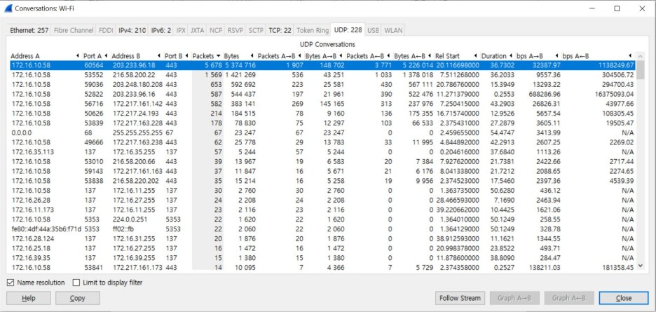 wireshark [statistics - conversation - udp - 특정 c-s 흐름 선택 - Follow stream]