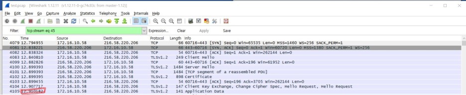 두 번째로 많은 패킷을 주고받은 주소 216.58.200.22의 이름은 i.ytimg.com이다. 위 주소와 통신하기 직전에 dns를 통해 위 주소를 얻어왔으며, 즉시 통신을 시작한 것을 알 수 있다.