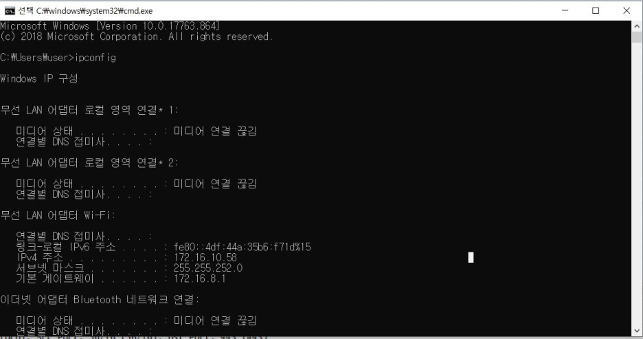 터미널에서 ipconfig 명령어를 이용하면 현재 자신이 사용하는 네트워크를 알 수 있다.