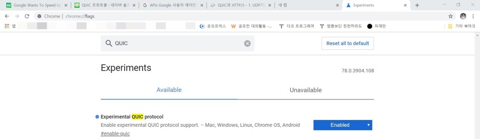 우선, QUIC은 아직 실험 단계인 프로토콜이기 때문에 좀 더 정확한 패킷 캡쳐를 위해 크롬 실험실에서 QUIC을 Enable 상태로 바꿔준다.