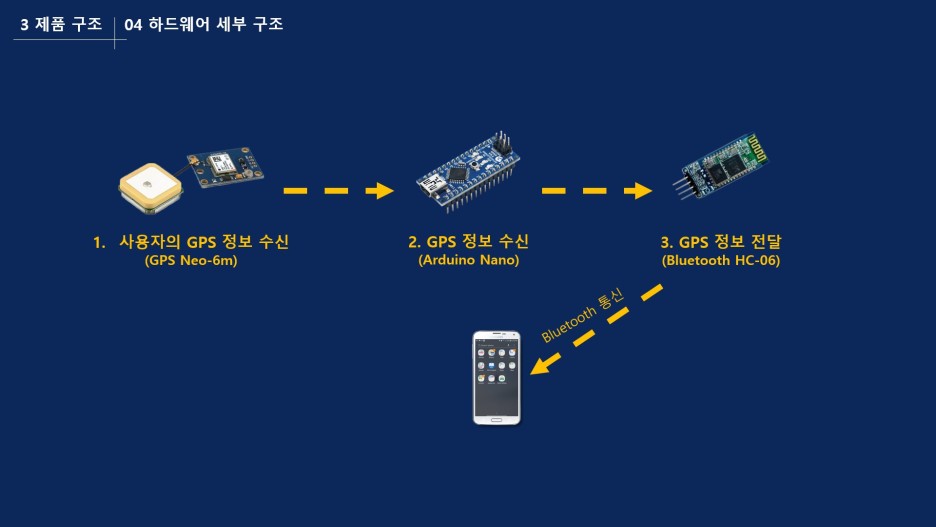 또, 이 GPS의 수신 신호가 굉장히 잘 끊긴다. 탁 트인 공간이나 탁 트인 대로변이 아닌 건물이 많은 골목 등으로 진입하면 금새 끊어져 버린다. 이는 GPS 정보가 핵심 기술인 우리 프로젝트에 있어 치명적인 결함으로 작용했기에 결국 아두이노 GPS 대신 핸드폰 GPS를 이용하게 되었다.(하드웨어와 사용자가 함께 움직이기에 가능했다. 현대인은 핸드폰을 몸에서 떨어트리지 않으니까)