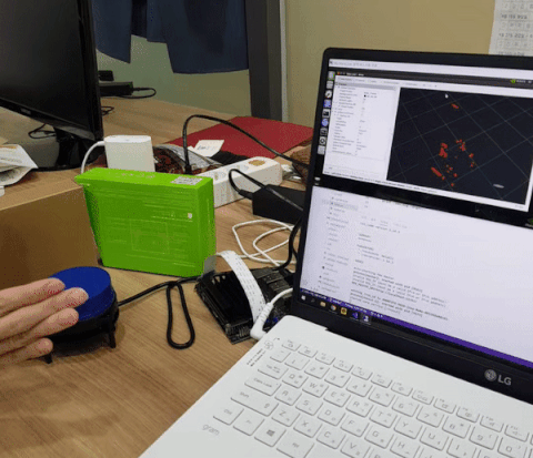 간단한 테스트를 위해 ROS로 구동하고 rviz로 디스플레이 해 보았다. 사무실 책상이 지저분해서 뚜렷하진 않지만 센서를 기준으로 주변 물체와의 거리가 빨간색 점으로 나타나고 있음을 알 수 있다.
