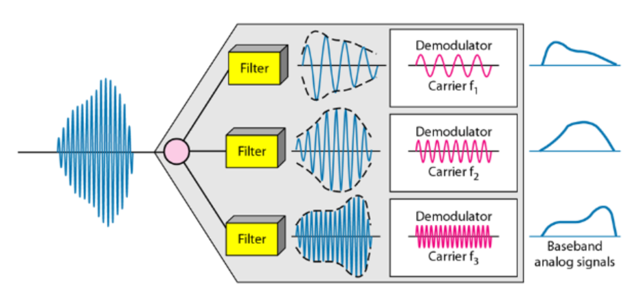 반대로 주파수 분할 다중화된 하나의 신호를 필터링을 거쳐 분리하는 과정을 DFDM(역다중화)라고 한다.