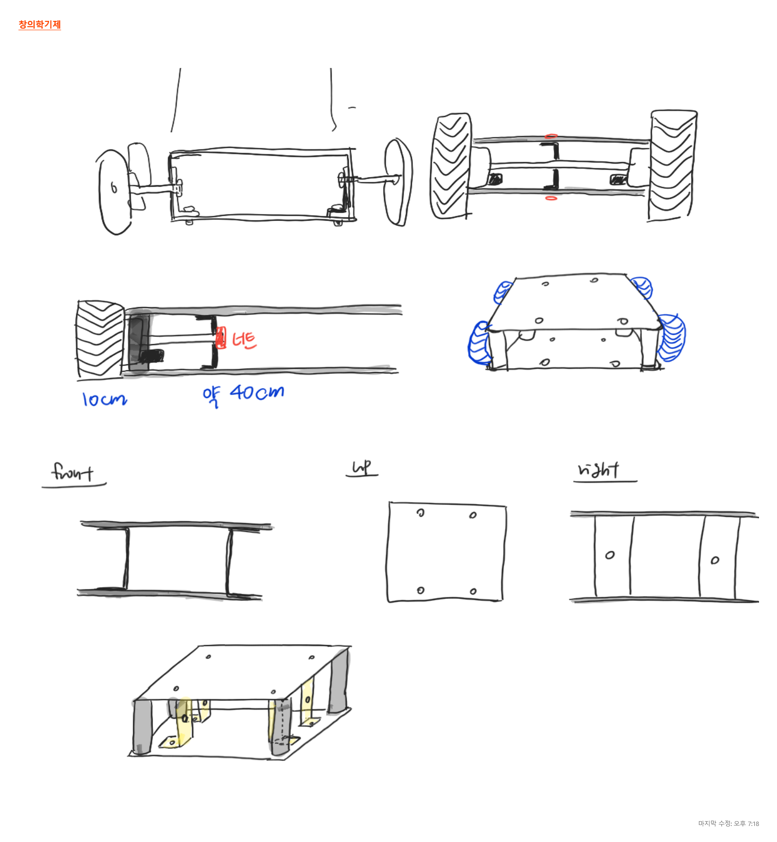 그림으로 그려본 구상도랑 흡사하게 만들어 봤는데, 줄자가 없어서 라이다나 카메라 센서 등 실제 부품들의 크기를 정확하게는 몰라서 대강 디자인만 잡았다.