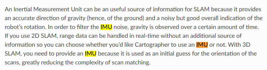 cartographer docs에 따르면 2d SLAM에서는 imu data는 있어도 그만 없어도 그만이라는 것 같아서 우선 odometry 토픽만 사용했다.
